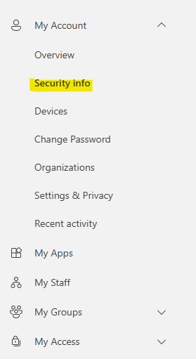 - Otherwise click Security Info in the left panel then click Add sign-in method.